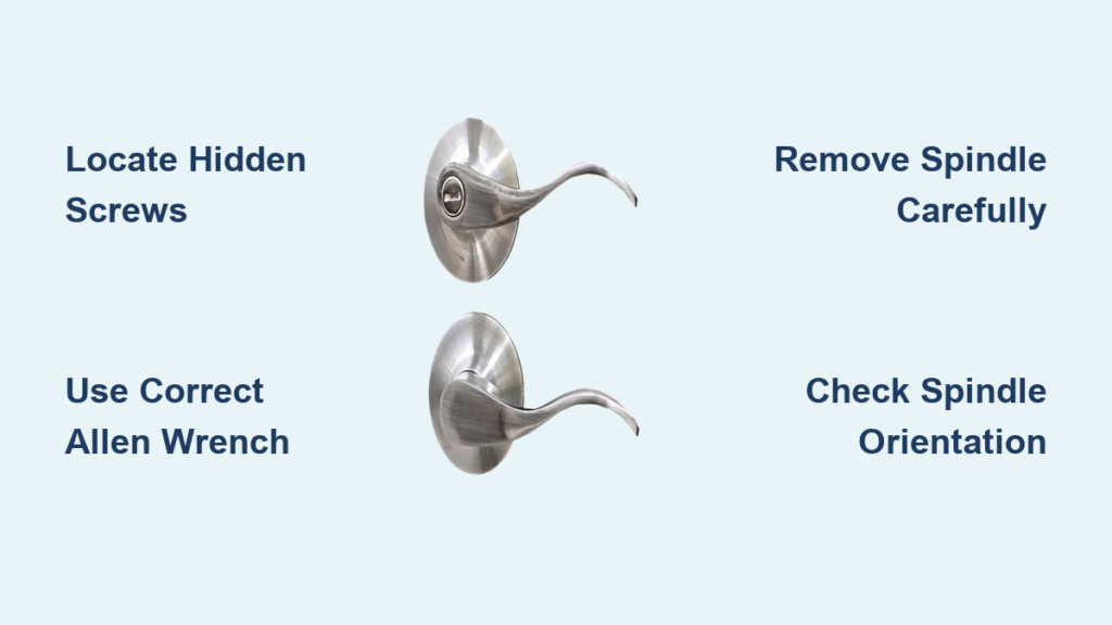 If your lever has no visible release, it’s likely secured by a set screw hidden under the lever’s end cap. Pry the cap gently with a knife tip—most snap off cleanly to reveal a 3/32″ Allen socket. Skip this step and you’ll strip the screw head, turning a 10-minute job into a 2-hour repair. Document each discovery with phone photos; handle assemblies have left/right orientation that’s easy to miss during reassembly.
